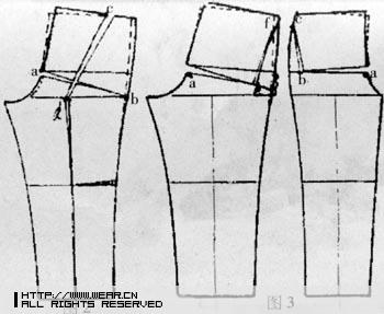 其体型特征是腹部向前挺,臀部相对较平缓,脚跟后倾。着装后出现在裤子上的弊病是裤立裆前短后长,腹部略紧,裤角则前空后贴。处理的方法是(1)将前片横裆线ab剪开,向上拉开a点,使立裆深增加,弥补前裆短的弊玻(2)将后片臀围线c点与d点连线,向下叠合c点,使后翘降低,修正后裆长的弊病(见图一)。与后倾体体型相反的体型是前倾体体型,其着装后出现在裤子上的弊病及处理方法都与后倾体体型相反。只要掌握后倾体体型的处理方法,那前倾体体型的处理方法也就迎刃而解了。